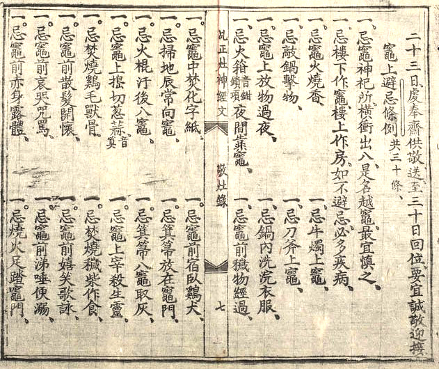 Đại ý trang số 6 và trang số 7 nguyên văn Hán cổ có ghi: “Thập nhị nguyệt, nhị thập tứ nhật, Tý bài thượng tấu, Thiên Tào tuế chung thiện ác bộ (bạc ). Nghi tiên ư nhị thập tam nhật kiền phụng trai cúng kính tống chí tam thập nhật hồi vị yếu nghi thành kính nghinh tiếp Táo thượng tị kị điều liệt:”